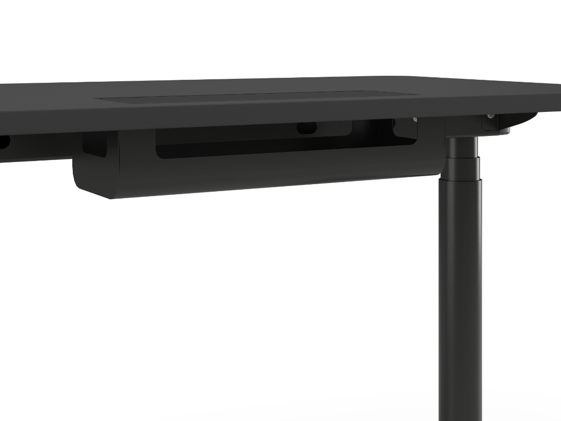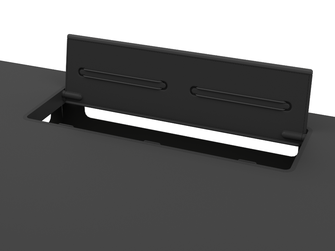 配線ケーブルを収納する為のトレーは作業効率の邪魔とならないよう、天板の下に配置されています。また、摩擦ヒンジの溝を活用する事でスマートフォンやタブレットのスタンド代わりとしても使用できます。