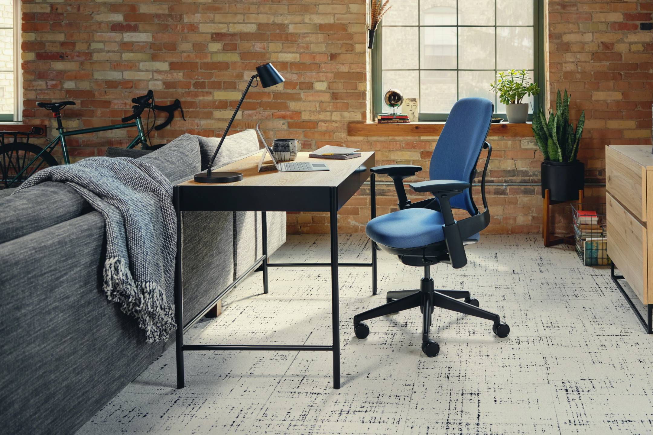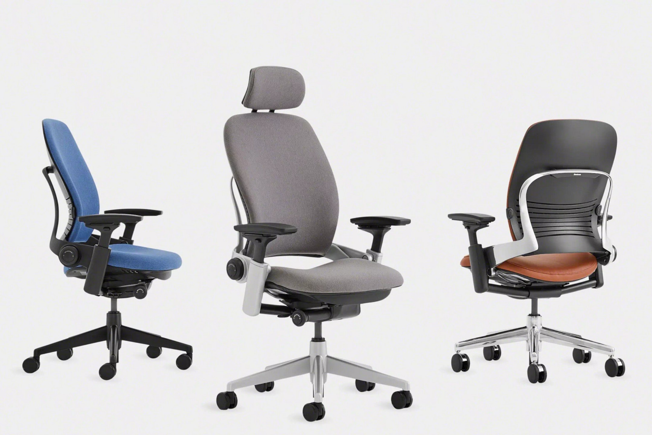 座り方やリクライニングの位置を問わず、身体の姿勢に合わせてサポートする事で快適な座り心地を提供するチェアがLeap。機能面では座面の奥行き・アームを全面的に調節、ランバーサポートを背中の下部から腰にかけてお好みの位置に高さと硬さを整える事も可能です。その他空気圧による座面高さ、リクライニングの反発力、及び5段階のリクライニングロックによる調節が可能です。背もたれと座面は触り心地の良い布張りです。
